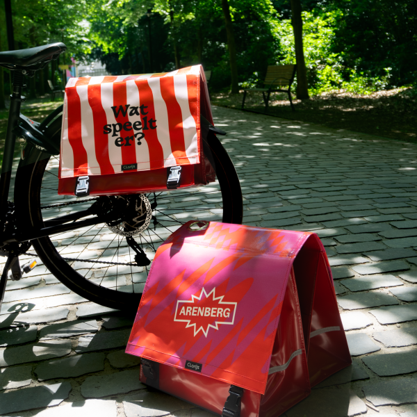 Stijlvol cruisen door 't stad? Met onze iconische Arenbergfietstassen pimp je jouw oude wrak of geef je die gloednieuwe fiets de finishing touch. En heb je altijd ruimte om je picknick, inkopen, huisdier of regenbroek mee te nemen. (Huisdier op eigen risico.)